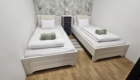 Az egyik hálószobában egy 160 cm széles franciaágy, a másikban két 90 cm széles szingli ágy található, a nappaliban egy ülőgarnitúra, mely kihúzva ággyá alakítható.